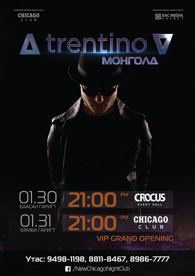 DJ нарын дунд RedBull-ээс зохиодог Thre3Style тэмцээний 2013 оны Дэлхийн аварга алдарт DJ TRENTINO 1 сарын 29нд Монголд ирэх бөгөөд тус DJ-г Монголын Chicago Club өөрсдийн нээлтэд зориулан урьж авч ирж байгаа юм байна. 1сарын 30нд Crocus Event Hall-д залуусд зориулан энэ оны анхны томоохон хэмжээний шоу болох ба маргааш нь буюу 31нд Chicago Club-д VIP нээлтийн шоу дээр тус тус тоглох юм байна. Мөн энэ томоохон арга хэмжээнд орос улсаас мэргэжлийн бүжигчин бүсгүйчүүдийг авчирж хөтлөгчөөр нь та бидний сайн мэдэх залуу жүжигчин Ууганаа хөтлөх сурагтай.Тус шоуны таксны үнийн хувьд чанартай хөтөлбөртэй томоохон арга хэмжээ гэхэд боломжын үнэтэй байх бөгөөд:1 сарын 30нд Crocus Event Hall-д такс 30.000₮1 сарын 31нд Chicago Night Club-д такс 50.000₮үнэтэйгээр тус тус худалдаалагдах юм байна.