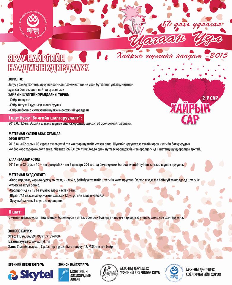 Тэгвэл уг наадмын бичгийн шалгаруулалт өнөөдрөөс эхэлжбайгаа бөгөөд 2015 оны 1-р сарын 21-ээс 2-р сарын 10-ны хооронд оролцогчдын материалыг хүлээн авах аж. Орон нутгаас “Цагаан уул – 2015” хайрын шүлгийн наадамд оролцох иргэд бүтээлээ 2-р сарын 8-ны дотор орон нутаг дахь МЗХ-ны салбараас тодорхойлолт авч бүтээлээ ирүүлэх бол, нийслэл хотод байгаа иргэд бүтээлээ 2-р сарын10-ны дотор МЗХ-ны 204 тоотод бичгээр авчирч өгөх, мөн МЗХ-ны [email protected] онлайн хаягаар ирүүлж давхар явуулах бөгөөд яруу найрагч бүр гурванбүтээлээ ирүүлэх боломжтой аж. Материал ирүүлэхдээ өөрийн овог нэр, утас, харьяа сургууль, хаяг, и-мейл, FB хаягийг шүлгийн хамт ирүүлэх гэнэ. Эдгээрийн аль нэг нь байхгүй тохиолдолд уг материалыг хүлээн авахгүй юм байна.