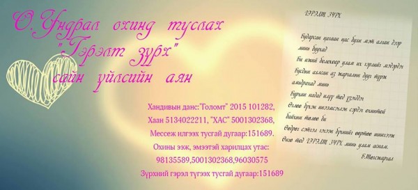 10885104_836863763018983_4233547699609414953_nО.Ундрал охин одоо  жил бүр 2 удаа, нийт 8-9 удаагийн төмрөө сунгуулах цуврал хагалгаанд орно. Ийм жаахан биенээс гарамгүй их тэсвэр тэвчээр шаардсан эмчилгээг  давж гарах сэтгэлийн хаттай бяцхан охин, эмчилгээний зардлыг нь олохын тулд өдөр шөнөгүй зүтгэж байгаа сайхан сэтгэлт ээж, үргэлж асарч тойлдог 2 сайхан эгч нь,  сэтгэлийн мухарт ач охиноо эдгэрээд босож гүйж тоглохыг нь харахыг хүсдэг настай эмээд амьдрал, аз жаргал бэлэглэх “Гэрэлт зүрх” аяныг зохиолч, сэтгүүлч Шүүдэрцэцэг эхлүүлжээ. Тэрбээр “Төрүүлсэн үрээ өвлийн хүйтэнд оршуулгын газар аваачаад хаячихдаг, хүйтэн орцонд орхичихдог хүйтэн сэтгэлтэй эхчүүд зөндөө байхад өргөж авсан өвчтэй охиныхоо төлөө амиа тавьж яваа хүний зүрх сэтгэл яасан их гэрэл гэгээ цацруулна вэ? Би өөрөө ч гурван охины ээж. Яг над шиг гурван охинтой, энэ ээжид туслахгүй байж тэсэхгүй нь. Энэ аяндаа МОНГОЛЫН АГУУ СОЁЛ, УЛАМЖЛАЛЫН МАНААЧ ЗОХИОЛЧ ЯРУУ НАЙРАГЧДАА НЭГДЭХИЙГ ХАМГИЙН ТҮРҮҮНД УРИАЛЖ БАЙНА. ” гэсэн байна.