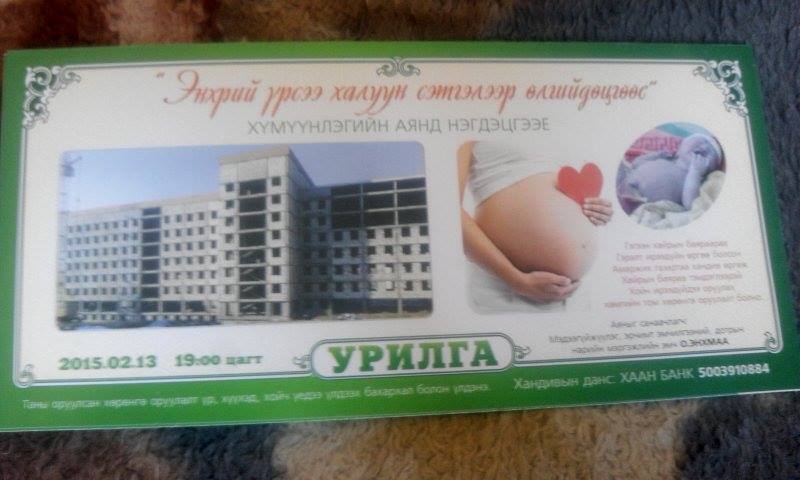 Жилийн жилд төрөлт нэмэгдэж байгаа. Харин Монгол улс шинэ хүнээ угтах байр нийслэлд хангалтгүй байгаа. Тиймээс 4-р амаржих газрыг байгуулах ажлыг эхлүүлсэн ч өнөөдөр тус барилгыг “царцаагаад” байгаа. Тэгвэл энэ барилгын ажлыг түргэтгэх зорилгоор 2-р амаржих газрын мэдээгүйжүүлэг, эрчимт эмчилгээний, дотрын нарийн мэргэжлийн эмч О.Энхмаа “Энхрий үрсээ халуун сэтгэлээр өлгийдөцгөөе” аяныг өрнүүлж байна. Аяны хүрээнд “Энхрий үрсээ халуун сэтгэлээр өлгийдөцгөөе” тоглолтыг зохион байгуулахаар төлөвлөөд байгаа юм байна. Тоглолтод Монгол рок, попын төлөөлөл болсон хамтлаг дуучид оролцох бөгөөд тоглолт 2015-02-13-ны өдөр Улаанбаатар паласын концертын их танхимд болно. Тоглолтын болон аяны дэлгэрэнгүй мэдээллийг 9974-8016 болон 9925-2540 дугаараас тодруулах боломжтой.