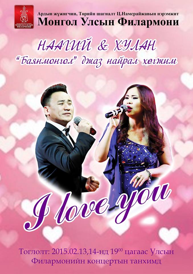 Улсын Филармонийн гоцлол дуучин Н.Наранбаатар, Ц.Хулан нар жил бүрийн 2-р сарын 14 нд тохиодог гэгээн хайрын өдрийг тохиолдуулан “Би чамд хайртай” тоглолтоо үзэгчдийн хүртээл болгох гэж байна. Дөрөв дэх жилдээ  уламжлал болон зохион байгуулагдах тус тоглолтонд улсын Филармонийн Баян монгол джаз оркестр, Симфони найрал хөгжмийн бүрэлдэхүүн оролцон тоглох бөгөөд  “Love theme from Romeo&Juliet”, “Casablanca”, “Unchained melody” зэрэг дэлхийн үзэгчдийг байлдан дагуулсан олон сайхан хайрын дуунууд эгшиглэх юм.