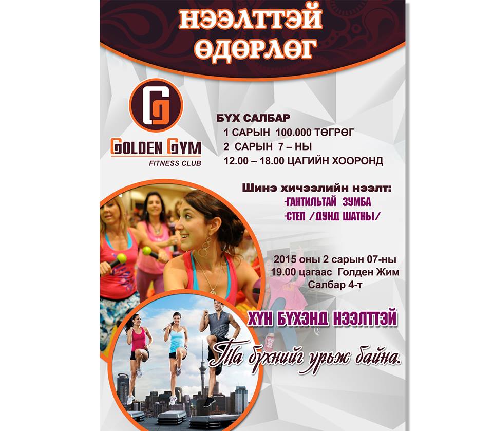 Байгуулагдсан цагаасаа нийтийн биеийн тамирыг хөгжүүлэх үйлсэд хувь нэмрээ оруулан зүтгэж байгаа “Голден жим”фитнес клуб дөрвөн салбартаа нээлттэй өдөрлөг зарлалаа. Уг өдөрлөгт та тус клуб явахыг хүсч байгаа сонирхож буй бүхий л хүмүүст үүд хаалга нь нээлтэй гэдгийг хэлэхэд таатаж байна.