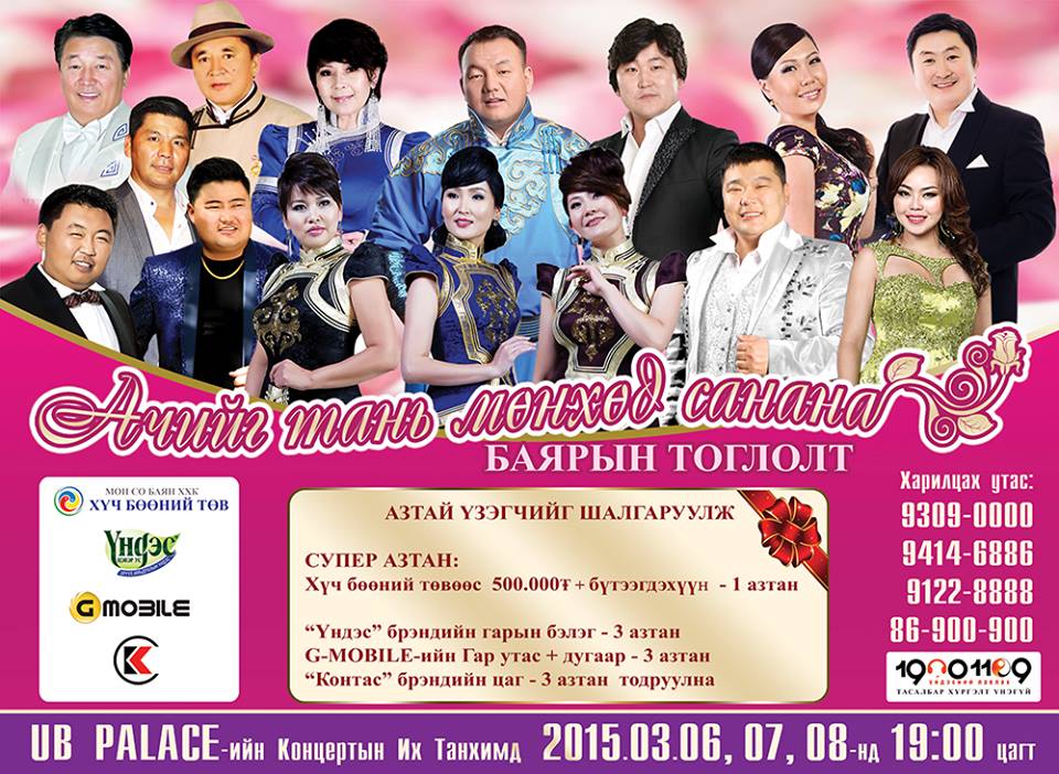 Тоглолтын ивээн тэтгэгчээр Мон Со Баян ХХК, "Хүч бөөний худалдааны төв", "Үндэс"-Цэвэр ус, "G-Mobile" зэрэг Монголдоо тэргүүлэгч томоохон байгууллагууд ажиллаж байгаа юм байна. Тоглолт: UB паласын концертын их танхимд 2015.03.06, 07, 08-ны өдрүүдэд 19:00 цагаас тоглогдох ажээ. Эрхэм залуу та энэ гайхалтай өдрөөр хайртай эхнэр, хайрт ижийгээ баярлуулахыг хүсвэл нийтийн дууны уран бүтээлчидтэй хамт нэгэн үдшийг дурсамж дүүрэн өнгөрүүлээрэй. Тасалбарыг 1900-1109 утсаар үнэгүй хүргэх юм байна.
