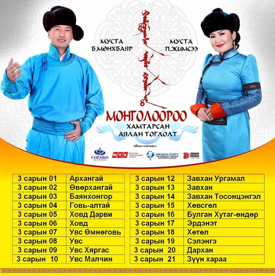 "Хайртайгаа хэлье", "Аавын минь бичсэн захиа" зэрэг дуугаараа та бидний танил болсон залуу дуучин МУСТА Б.Мөнхбаяр, МУСТА П.Жимсээ нар дуу хуураар хөглөгддөг монгол түмэндээ зориулаад "Монголоороо" хэмээх нэртэй аялан тоглолтоороо бэлэг барихад бэлэн болжээ. Тоглолт ирэх 3 дугаар сарын 1-ны өдрөөс эхлэн 21-ныг дуустал Монгол нутгийнхаа өнцөг булан бүрт суугаа дуунд дуртай дуучин түмэндээ үргэлжлэн хүрэх ажээ.