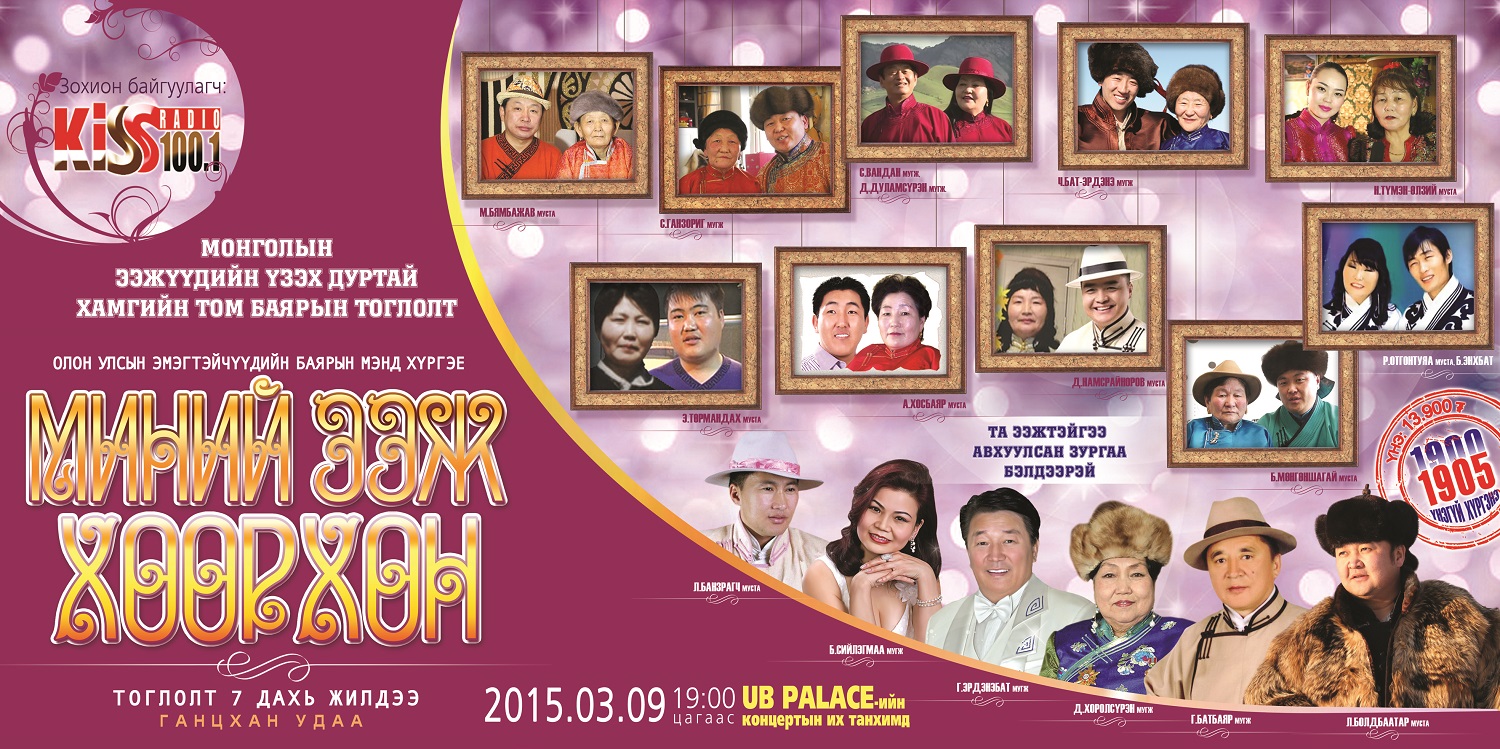 Хамгийн олон дуучид уригдан оролцдог, хамгийн нэр хүндтэй, хамгийн сайхан тоглолт  бол Миний ээж хөөрхөн. Хүн  бүрт ижийтэйгээ авахуулсан  нандин зураг байдаг. Тэгвэл та  ээжтэйгээ  авахуулсан зургаа бэлдээрэй. 3000 ээж  сэтгэлээ нийлүүлэн дуулах тэр торгон агшинд таны ижийн зураг Миний ээж хөөрхөн тоглолтын дэлгэц дүүрэн гарч ижийд тань гэнэтийн бэлэг барина.