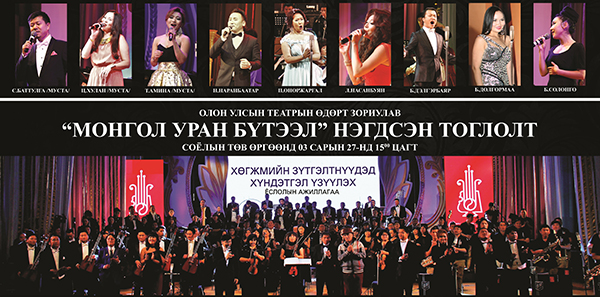Монгол Улсын Филармоноос санаачлан хэрэгжүүлж буй “МОНГОЛ УРАН БҮТЭЭЛ” хүндэтгэлийн гала тоглолт СТӨ-д 03 сарын 27-нд буюу Олон улсын театрын өдрөөр болох гэж байна. Тус төслөөр монголын шилдэг хөгжмийн зохиолчдын бүтээл туурвилаас бүрдсэн цуврал тоглолтуудыг бүтэн улирлын турш үзэгчдээ хүргэж, монголын хөгжмийн мэргэжлийн түвшинд бүтээн туурвисан монгол уран бүтээлүүдийн тоог нэмэгдүүлэх, сурталчлах, түгээн дэлгэрүүлэх, бүтээл туурвигчдыг алдаршуулах, бүтээлийг эдийн засгийн эргэлтэнд оруулах олон талт үйл ажиллагаа явууллаа.