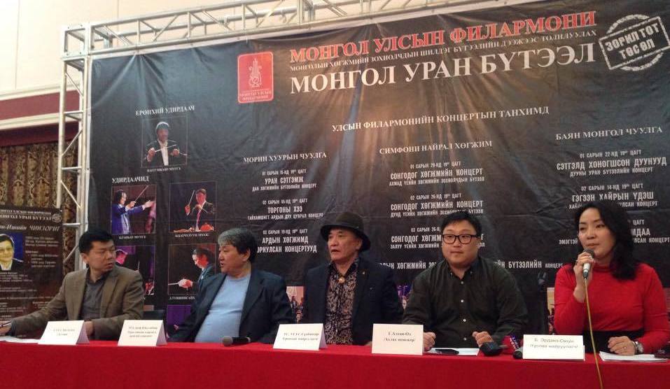 Монгол уран бүтээл төслийн хүрээн дэхь төлөвлөгөөт уран бүтээлүүд амжилттай тоглогдож нэгдүгээр улиралын хаалтын тоглолтоо үзэгч, сонсогчдодоо өргөн барихад бэлэн болоод байгаа бөгөөд өчигдөр буюу 03-р сарын 24-нд “МОНГОЛ УРАН БҮТЭЭЛ” нэгдсэн ГАЛА тоглолтын хэвлэлийн бага хурал улсын Филармонийн танхимд боллоо. Хэвлэлийн бага хуралд Монгол улсын Филармоний уран сайхны удирдаач Н.Бүтэнбаяр /МУУГЗ/, ерөнхий найруулагч С.Сүхбаатар /МУУГЗ/, туслах найруулагч Б.Эрдэнэ-Оюун, маркетингийн менежер Г.Алтан-Од нар оролцсон.
