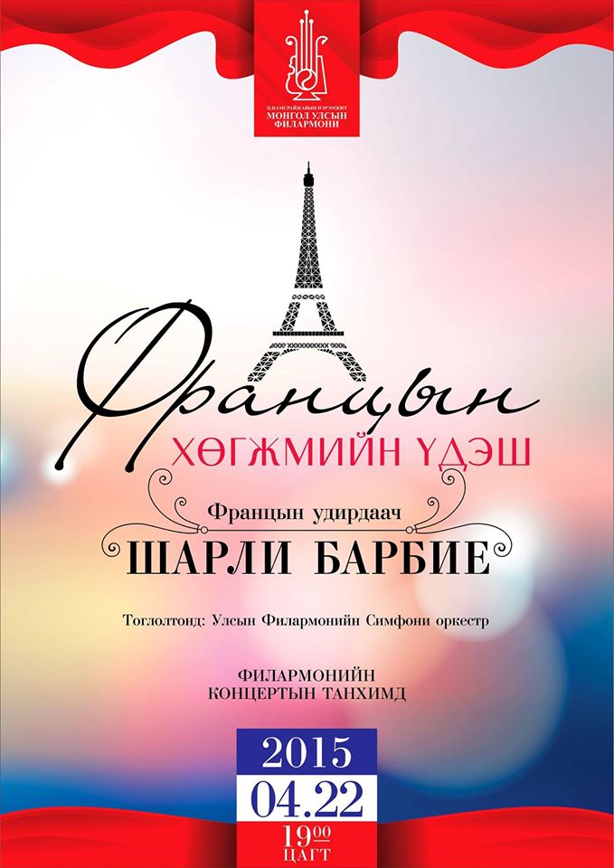 Монгол улс дахь Франц улсын элчин сайдын яамны урилгаар нэрт удирдаач Шарли Барбие Францын сонгодог хөгжмийн гоо сайхан, уран тансаг аялгууг үзэгч та бүхэнд толилуулахаар хүрэлцэн ирлээ.