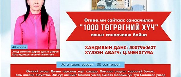 Тиймээс Ховд аймгийн Дарви сумын харьяат Ц.Мөнхтуяа хэмээх эмэгтэйд сайхан сэтгэлийн гараа сунгаж, “1000 төгрөгний хүч” аяны давалгаанд нэгдэхийг эрхэм уншигч та бүхнээсээ уриалж байна.