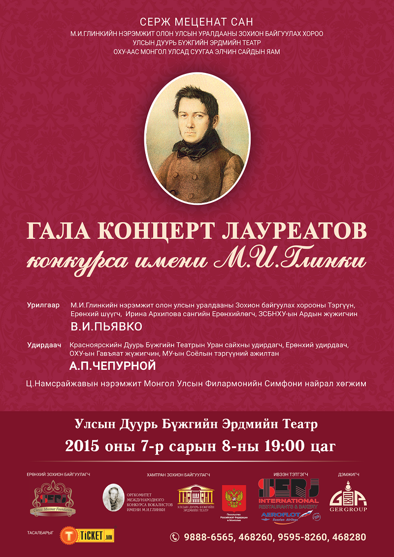 "ГАЛА КОНЦЕРТ ЛАУРЕАТОВ конкурсаимени М.И.Глинки "тоглолт 2015 оны 07-р сарын 08-ны өдөр УДБЭТ-ын алтан тайзнаа ганцхан удаа болно.