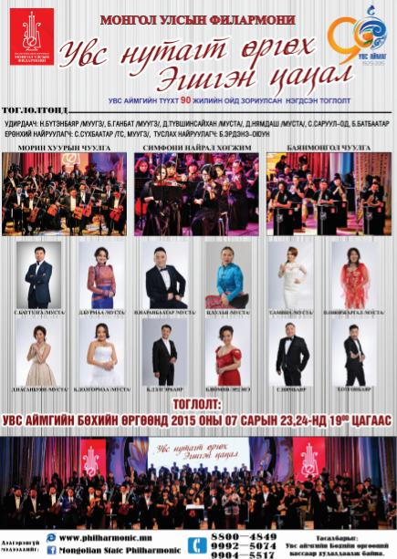 Т.Отгонбаяр нар ая дууны эгшгэн хадаг өргөх юм. Концертын ерөнхий найруулагчаар ТС, МУУГЗ Сэвжидийн Сүхбаатар  ерөнхий удирдаачаар МУУГЗ Намсрайжавын Бүтэнбаяр нар ажиллаж байгаа юм. Тоглолын тасалбарыг Ойрад театрын кассаар болон Увс аймгийн бөхийн өргөөний кассаар худалдаалж байна. Дэлгэрэнгүй мэдээллийг:8800-4849, 9904-5517 дугаарын утаснаас тодруулна уу.