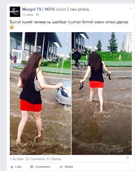 Рок, попын ертөнцөд өөрийн гэсэн өнгө аясаараа хэдийнэ танил болсон СТА, дуучин Э.Болор-Уянгыг танихгүй хүн ховор. Өчигдрийн борооноор үерийн усыг хөл нүцгэн туулж буй эмэгтэйн зураг сошиал ертөнцөд тархсан билээ.