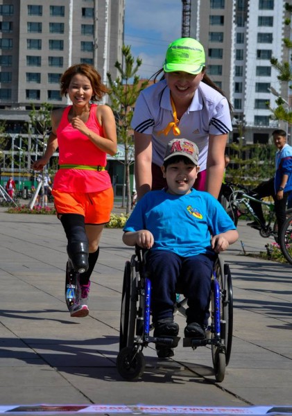 marathon1 (5)О.Саранчулуун хэмээх нийгмийн ажилтан эмэгтэйг энд дурдахгүй байх боломжгүй. Тэрбээр хөгжлийн бэрхшээлтэй боловч бусдыг сайн үйлсэд уриалан ил гарч ирснээр нийтэд Монголын Форест Гамп, Сэлмэн хөлт эмэгтэй, Нуман хөлт гэх мэтээр танигдсан байдаг. Түүний үүсгэсэн цахим бүлэгт хагас жилийн дотор 3000 гаруй гишүүн өөрсдөө хүсэлтээрээ элсэж, бямба гараг бүрт болдог гүйлтэнд давхардсан тоогоор 500 гаруй хүн, үүнээс 100 орчим нь хөгжлийн бэрхшээлтэй хүмүүс тогтмол оролцох болов. “Хамтдаа гүйцгээе” аяны хүрээнд 2014 онд бүх нийтийн гүйлтийг 2 удаа зохион байгуулж уг үйл ажиллагаанд 300 гаруй сайн дурын ажилтан, 1300 гаруй гүйгч, 300 орчим хөгжлийн бэрхшээлтэй хүмүүс оролцсон байдаг.