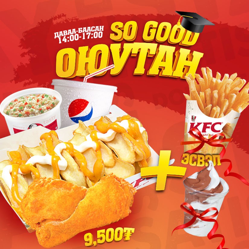 So good Оюутнууддаа зориулсан урамшуулал KFC рестораны бүх салбарт үйлчилэх тул та ангийн анд найзуудтайгаа өдрийг хөгжилтэй, дурсамж дүүрэн өнгөрүүлээрэй.