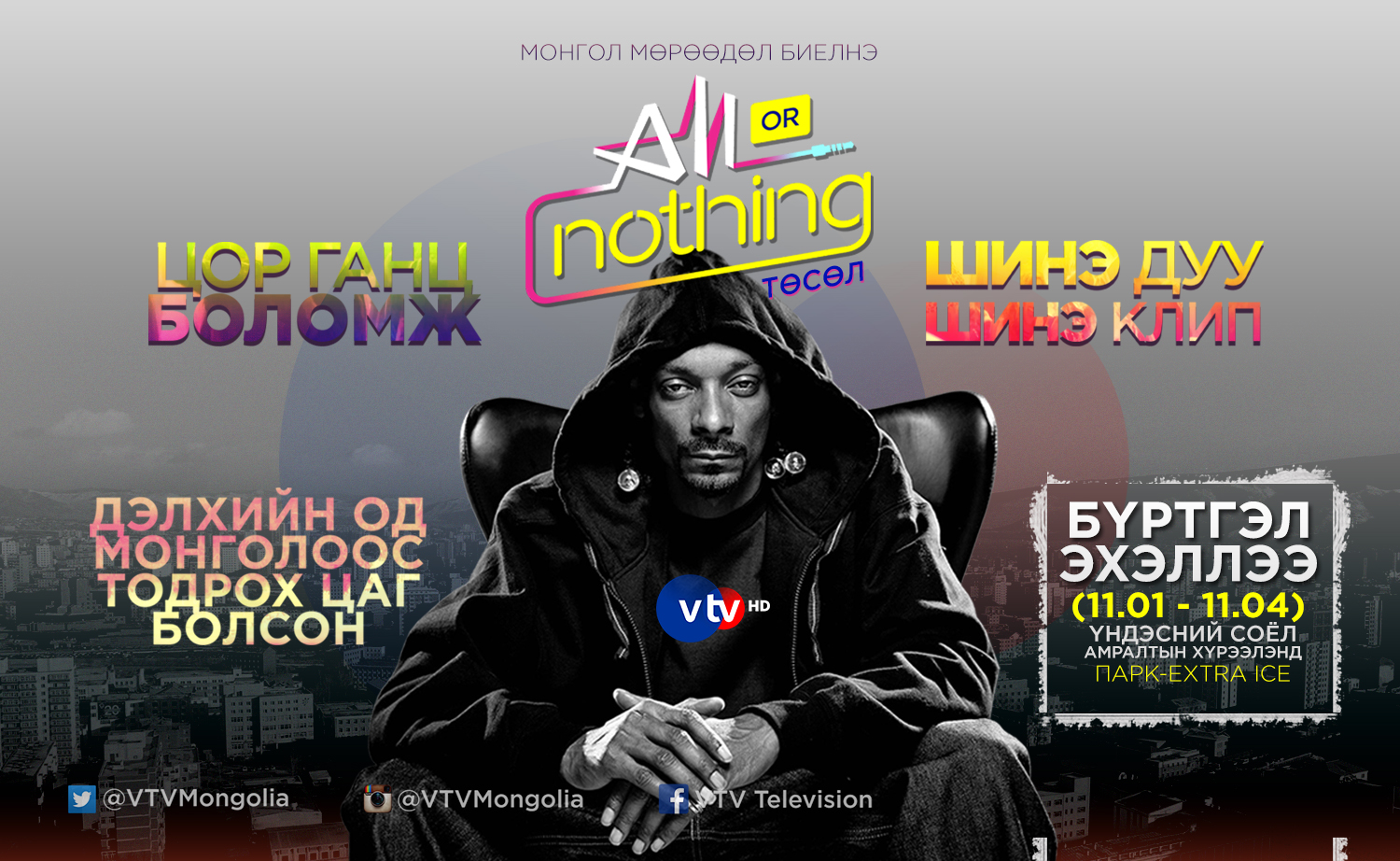 Манай шоу төслийн гол баатар бол дэлхий даяар хамгийн олон сонсогчтой алдарт реппер SNOOP DOGG юм. Snoop Dogg болон, түүний ажлын хамтрагч DCAT Cornelius нар нь Бразил, Мексик, Пуэрто Рико, Франц зэрэг дэлхийн олон орны залуу ододтой хамтран дуулж байжээ. Үүний дотор манай хойд хөрш ОХУ-н реппер Timati, Солонгосын дуучин PSY нартай дуулж видео клипээ хийлгэж байсан билээ. Тэгвэл өнөөдөр Монголчуудын ээлж. Алдарт SNOOP DOGG той хамтдаа “ ALL or NOTHING” төсөлд оролцон, түүнтэй хамтран дуулж, видео клипээ хийлгэх цорын ганц, шилдгийн шилдэг Монгол авъяастныг бид хайж байна. VTV HD телевиз болон АНУ- н продюссер DCAT нар хамтран тодруулах уралдаант ТВ төсөл шоу нэвтрүүлэг эхлэхэд бэлэн боллоо.