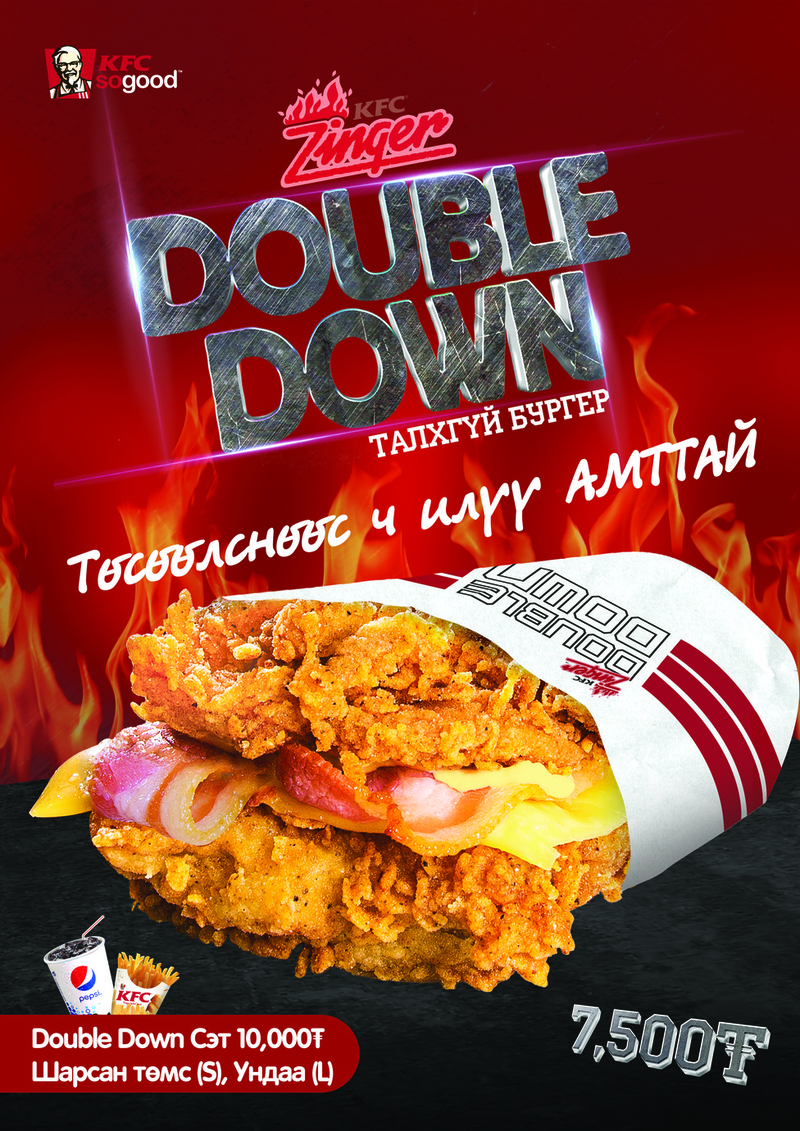 Та ч гэсэн Double Down бургерийг амталж үзээд, бидний саналыг толгой дохин инээмсэглэн зөвшөөрнө гэдэгт итгэлтэй байна. Учир нь энэ бүтээгдэхүүн маань үнэхээр шинэлэг, бас таны төсөөлснөөс ч илүү амттай.