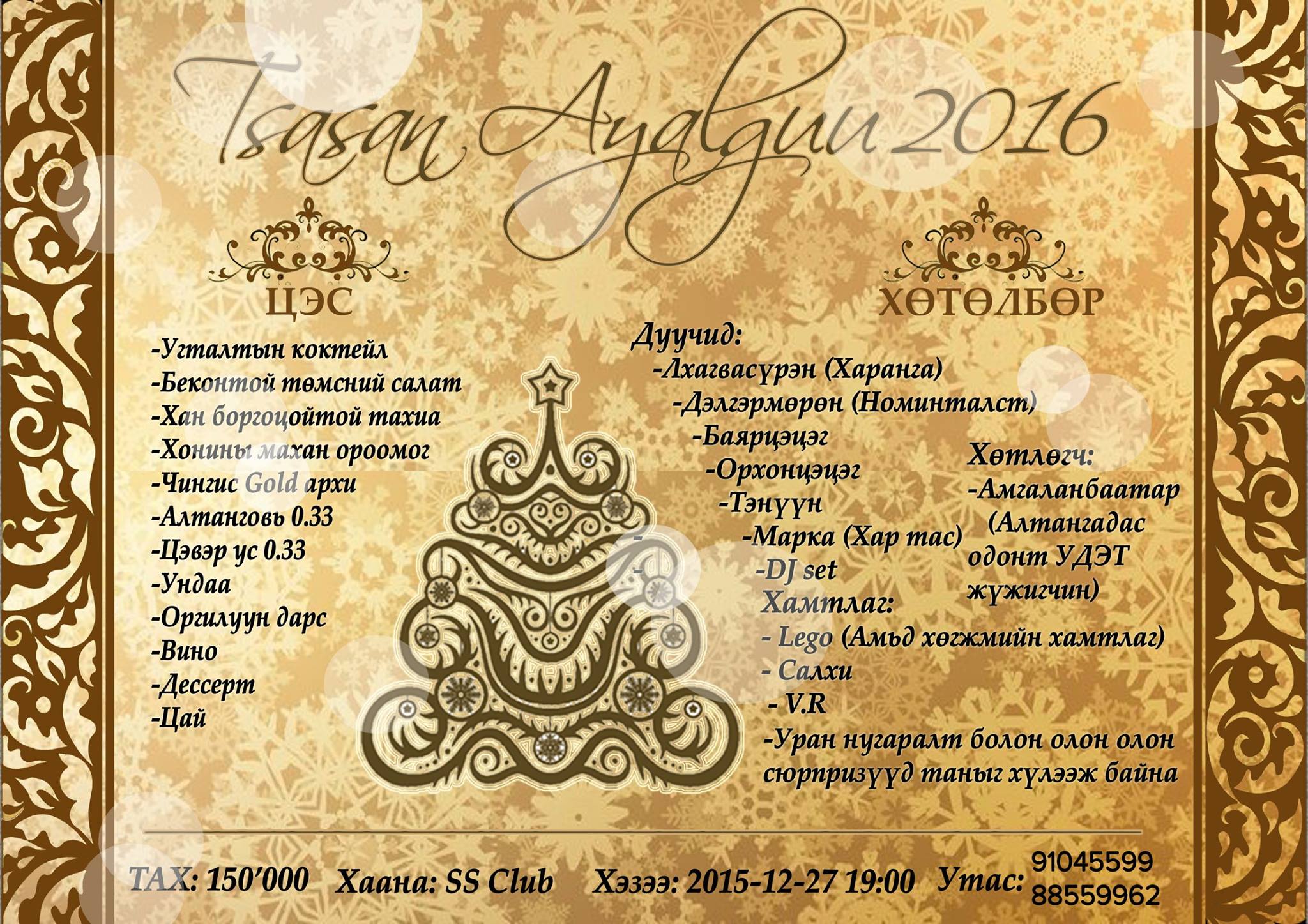 Тэгвэл цөөн тооны ажилчидтай байгууллага хамт олонд зориулсан "Цасан аялгуу" байгууллагуудын нэгдсэн шинэ жилийн арга хэмжээ энэ жил уламжлал ёсоороо зохион байгуулагдах гэж байна. Цэнгүүн 12 дугаар сарын 27-ны үдэш 19:00 цагаас "SS club"-д болох тул байгууллага хамт олон та бүхнийг урьж байна.