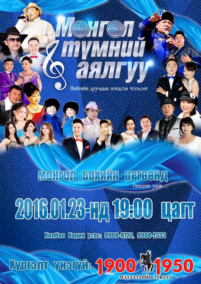 Монголын нийтийн дууны томоохон төлөөллүүдийн нэг дор нэгтгэсэн "Монгол түмний аялгуу" тоглолт энэ сарын 23-нд 19:00 цагаас ганцхан удаа болох гэж байна.