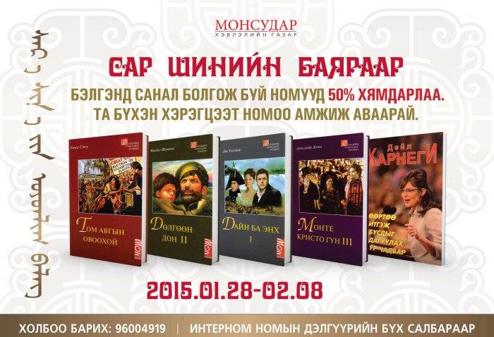 Сар шинийн бэлгэнд санал болгож Монсудар хэвлэлийн газраас эрхлэн гаргасан дэлхийн сонгодог зохиолууд, Би өөрөө сэтгүүл, Бяцхан ном-108 цуврал зэрэг олон төрлийн номууддаа 50%-ын хямдрал зарлажээ.