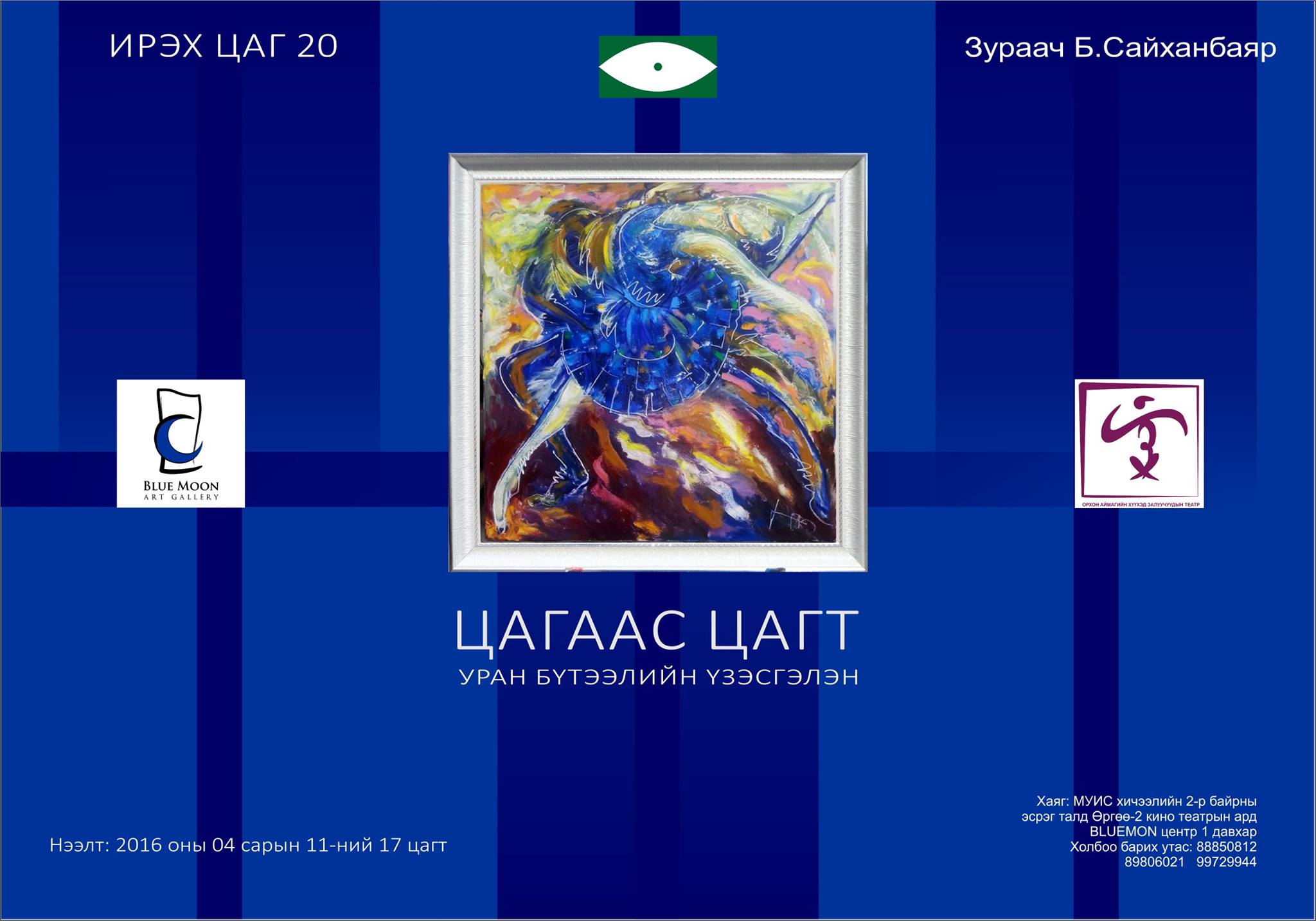 Урлагт хайртай, уран зургийг шимтэн сонирхдог хэн бүхэн Blue moon галлерейд саатаарай. 2016 оны 4-р сарын 11-ээс 20-ны өдрүүдэд зураач Б.Сайханбаярын "Цагаас цагт" үзэсгэлэн тус галерейд дэлгэгдэх гэж байна. Үзэсгэлэн дөрөвдүгээр сарын 11-нээс 20-ны өдрүүдэд дэлгэгдэнэ. Та бүхнийг хүрэлцэн ирэхийг урьж байна.