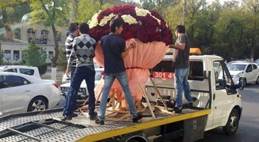 Энэхүү илгээмжийг хүргэхийн тулд дөрвөн залуу ачааны машин дээр баглаа цэцгийг түшиж явсан байна. Цэцгийн баглаа хэтэрхий их том байснаас бүсгүйн амьдардаг сууц руу оруулж чадаагүй гэнэ. Тиймээс цэцгийг гудамжинд үлдээхээс өөр аргагүй байгаагүй аж.