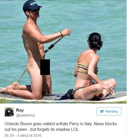 Жүжигчин Орландо Блум дуучин Кэти Перритэй хамт Италийн Сардини арал дээр амарч байгаа зураг интернетэд тавигджээ. Уг зураг дээр жүжигчин эр шав шалдан байх бөгөөд папараццичид Блумын нуудгай эрхтэнийг халхлахыг оролдсон бололтой.