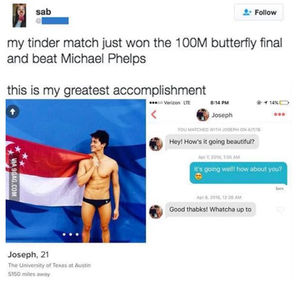 Сингапурын усан сэлэлтийн тамирчин Жозеф Шулинг аугаа Майкл Пелпсийг ялж олимпийн авраг боллоо. Өдгөө улсынхаа үндэсний баатраар тодроод байгаа царайлаг залууг бүсгүйчүүд нь ихэд сонирхож байна. Тэгвэл олимпийн аваргатай болзож байгаад Олимп эхлэхээс өмнө хаясан нэгэн бүсгүй өдгөө амаа барьж суугаа нь Америкийн Бостон хотын Сабрина Салазар аж.