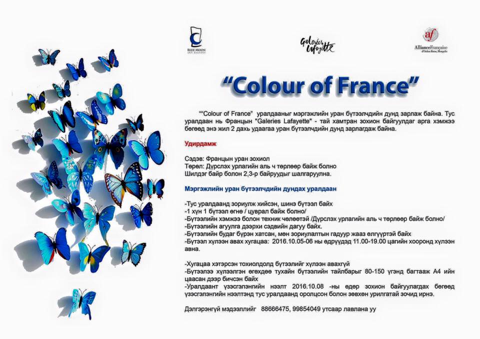 "Colour of France" уралдааныг мэргэжлийн уран бүтээлчдийн дунд зарлагджээ. Тус уралдаан нь Францын "Galeries Lafayette" – тай хамтран зохион байгуулдаг арга хэмжээ бөгөөд энэ жил 2 дахь удаагаа уран бүтээлчдийн дунд зарлагдаж байгаа юм. Үзэсгэлэн 2016.10.08 -ны өдөр нээлтээ хийнэ.