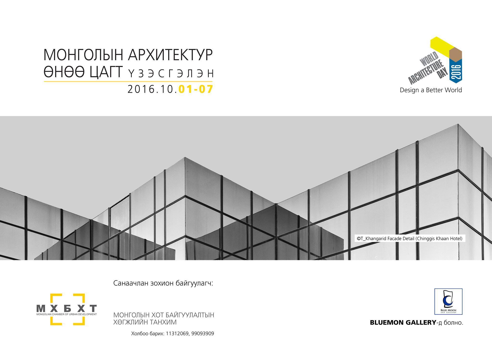 Дэлхийн архитекторуудын энэ өдрийг тохиолдуулан шилдэг залуу архитектор, уран бүтээлчдийн урлагийн бүтээлээр “Монголын Архитектур өнөө цагт 2016” үзэсгэлэнг 10-р сарын 01-нээс 07-ны өдрүүдэд “Блью Мүүн арт галерей” үзэсгэлэнгийн танхимд зохион байгуулж байна.