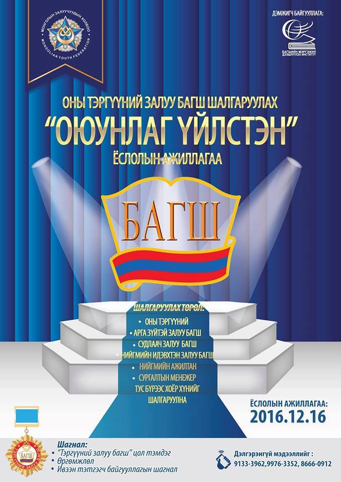 Оны тэргүүний багш шалгаруулах “Оюунлаг үйлстэн” ёслолын ажиллагаа болох гэж байна. Тодруулбал, МЗХ-оос Сурган хүмүүжүүлэх үйлсэд эрдэм мэдлэгээ зориулж буй багш нарыг урамшуулан алдаршуулах зорилгоор оны тэргүүний багш шалгаруулах “Оюунлаг үйлстэн” ёслолын ажиллагааг анх удаагаа 2016. 12. 16-нд зохион байгуулж Монголын Залуучуудын Холбооны нэрэмжит “Тэргүүний залуу багш “ цол тэмдэг, өргөмжлөлийг олгохоор болжээ.