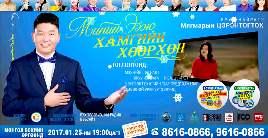 Монгол түмний дунд амнаас ам дамжин, сэтгэлээс сэтгэл дамжин өртөөлөн эгшиглэж буй уран бүтээл болох дуучин О.Гансувдын дуулсан “Миний ээж хөөрхөн” дууны шүлгийг бичсэн MOSCAP-ийн гишүүн, яруу найрагч Мягмарын Цэрэнтогтохын МИНИЙ ЭЭЖ ХАМГИЙН ХӨӨРХӨН нэртэй тайлан тоглолт 2017.01.25 нд 19 цагаас Монгол бөхийн өргөөнд болох юм байна. Тоглолтонд дуучин Э.Төрмандах, О.Гансувд, А.Түмэн-Өлзий, П.Жимсээ, жүжигчин Л.Сөрөлт гээд сүүлийн үеийн нийтийн дууны өнгө төрхийг тодорхойлж буй шилдэг уран бүтээлчид ая дуугаа өргөх юм байна. “Жаргалтай явна хоёулаа”, “Баярлаж явна уу ээжээ”, “Наран тэнгэр ижий” зэрэг дуунуудаар нь бид сайн мэдэх билээ.