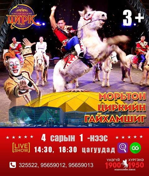 “Морьтон циркийн гайхашиг” тоглолтын тасалбар 10.000, 15.000 төгрөгний үнэтэй борлуулагдаж байгаагаас гадна Мобикомын 99 Candy болон Юнителийн 100 GG-ээр 50 хувь хөнгөлөлттэй үзэх боломжийг үзэгчиддээ олгож байгаа юм. Тоглолт 4-р сарын 1, 2-нд 14 цаг 30 минутаас, 4-р сарын 3, 4, 5-нд 18 цаг 30 минутаас тус тус тоглогдох бөгөөд билетийг Монголын үндэсний циркийн билетийн касс болон 1900-1950-аар үнэгүй хүргэнэ. Та бүхэн “Морьтон Циркийн Гайхамшиг” тоглолтоо үзэн циркийн гайхамшгаар аялаарай. Тоглолтын дэлгэрэнгүй мэдээллийг 325522, 95659012, 95659013 дугаараас лавлаж асууна уу.
