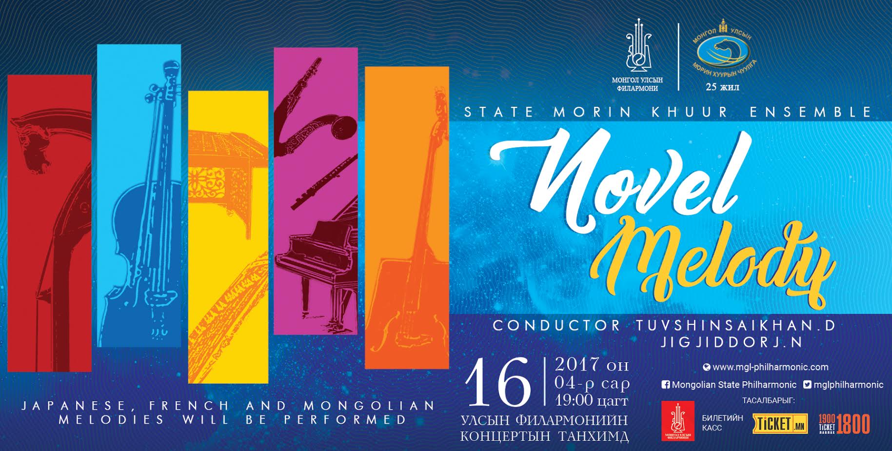 Монгол улсын морин хуурын чуулга жил бүр уламжлал болгон зохион байгуулдаг “Novel Melody” концертоо дөрөв дэх жилдээ улсын Филармонийн тайзнаа тоглох гэж байна. Морин хуурын чуулгын уран бүтээлчдийн мэргэжил, ур чадварыг харуулсан тус тоглолт жил бүр шинэ хөгжим, шинэ дуугаралт, шинэ өнгө аяс, агуулга гээд бүгд шинэлэг байдгаараа өвөрмөц билээ. Тус тоглолтод 100 хувь шинэ бүтээл эгшиглэх бөгөөд концертын урын санд Монголын шинэ залуу хөгжмийн зохиолч Т.Пүрэвсүх, Японы Ryuichi Sakamoto, Францын Claude Debussy, Manuel Ponce, Gabriel Faure зэрэг зохиолчдын бүтээл багтах аж.