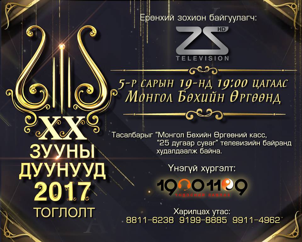 Монголын ард түмний сэтгэлд хоногшин үлдсэн гайхалтай сайхан дуунуудыг хүргэдэг “20 зууны дуунууд 2017” супер шоу тоглолт болох гэж байна. Эрхэм үзэгч, сонсогч та бүхэн аав ээж, найз нөхөд, хайртай дотны хүмүүсээ нэгэн үдэш сэтгэл юуг нь баярлуулахыг хүсвэл “20 зууны дуунууд 2017” тоглолтыг үзүүлээрэй.