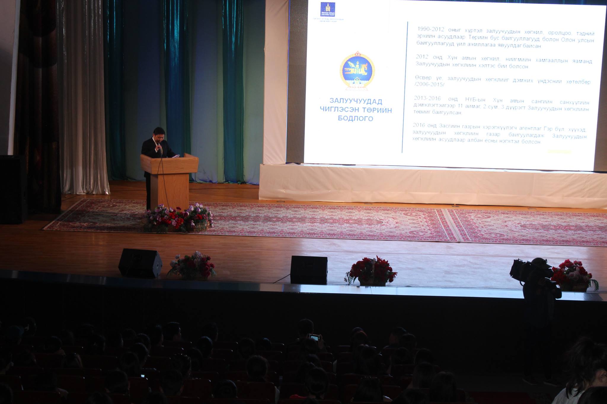 Монгол Улсын Засгийн газрын хэрэгжүүлэгч агентлаг Гэр бүл, хүүхэд, залуучуудын хөгжлийн газраас санаачлан XНXЯ, XXҮЕГазар зэрэг төрийн болон ТББ-ууд хамтран ИДСК, МСҮТ-ийн төгсөгчдийг ажлын байранд зуучлах "ХӨГЖЛИЙН ХӨТӨЧ" өдөрлөгийг өнгөрсөн Даваа гарагт буюу 5-р сарын 15-ны өдөр Соёлын төв өргөөнд 14:00-17:00 цагийн хооронд амжилттай зохион байгууллаа. Тус өдөрлөгийн хүрээнд УИХ-ын чуулганаар хэлэлцэгдэж буй “Залуучуудын хөгжлийг дэмжих тухай хууль”, Төрөөс залуучуудын хөдөлмөр эрхлэлтийг нэмэгдүүлэх чиглэлээр авч хэрэгжүүлж буй бодлого, үйл ажиллагаа зэргийг танилцуулсан юм.