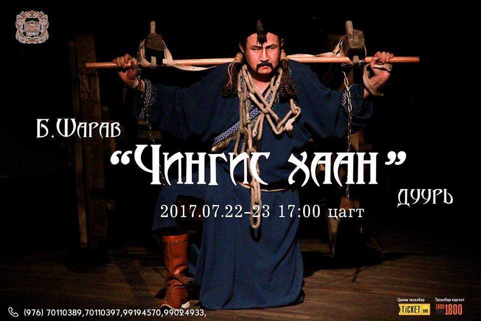 Улсын дуурь, бүжгийн эрдмийн театрын тоглолтын 54 дэх улирлын хаалтын дуурь “Чингис хаан”. Төрийн шагналт Б.Шаравын “Чингис хаан” дуурийг тус театрын уран бүтээлчид энэ амралтын өдрүүдэд /2017.07.22, 23/ эгшиглүүлэх нь ээ. Хоёр бүлэг, зургаан үзэгдэлт уг дуурь нь анх 2003 оны тавдугаар сарын 3-ны өдөр Улсын дуурь, бүжгийн эрдмийн театрын тайзнаа болж байжээ.
