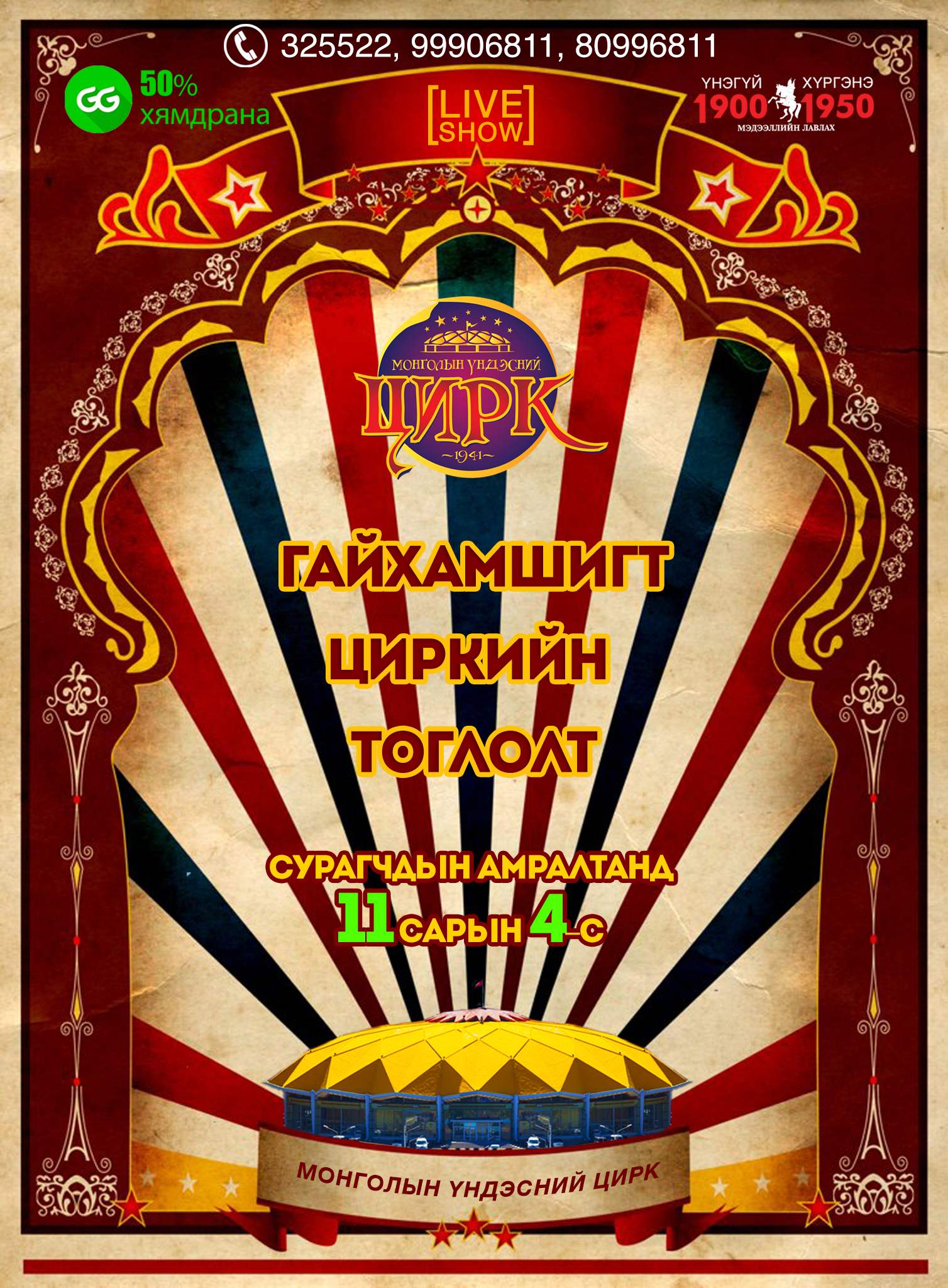 Монголын Үндэсний Циркийн сурагчдын амралтанд зориулсан тоглолт эхэлжээ. 11 сарын 4-ний өдрөөс сурагчдын амралтанд зориулан олон гайхалтай үзүүлбэрүүд багтсан “Гайхамшигт циркийн тоглолт” тоглоход бэлэн болоод байгаа юм байна. Энэхүү тоглолтонд Монголын жүжигчдийн олон улсад тоглогддог шилдэгийн шилдэг үзүүлбэрүүд багтсан бөгөөд цухас дурьдахад Монте Карло тэмцээний шагналт акробатын үзүүлбэр, дэлхийд цөөхөн тоглогдсон амь дүйсэн агаарын цагираг, аварга могойн үзүүлбэр болон олон жилийн дараа дахин тоглогдож буй хүнд жин, хүч тамирын гайхамшигт үзүүлбэр, хүүхэд багачуудын хайртай алиалагч, хачирхалтай илбийн үзүүлбэр гэх мэт нүд хужирлам олон сайхан үзүүлбэрүүд тоглогдох нь.