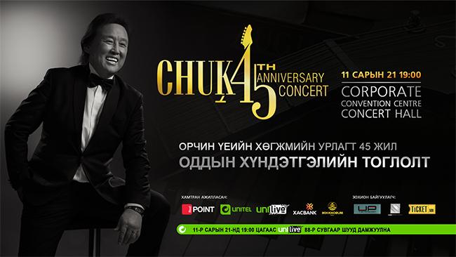 “Харанга” хамтлагийн гишүүн, хөгжмийн зохиолч МУУГЗ Цэрэндоржийн Чулуунбат “BEST OF CHUKA-45” хүндэтгэлийн тоглолт өнөөдөр болох гэж байна. 1972 оноос хойш өнөөг хүртэл хөгжмийн урлагт зүтгээд 45 жил болж байгаа бөгөөд энэ хугацаанд олон сайхан дуу зохиож, амилуулж байсан билээ.