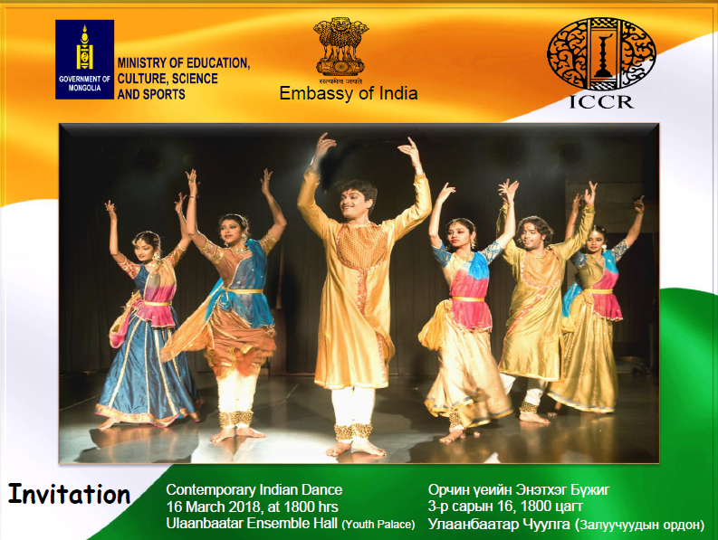 Монгол Улсын Засгийн газар, Бүгд Найрамдах Энэтхэг Улсын Засгийн газар хооронд “Соёлын салбарт 2015-2018 онд хамтран ажиллах тухай” хөтөлбөрт тусгагдсан арга хэмжээний хэрэгжилтийн хүрээнд Энэтхэгийн үндэсний бүжгийн хамтлаг 2018 оны 03 дугаар сарын 15-18-ны өдрүүдэд Монгол Улсад айлчлан тоглох гэж байна.