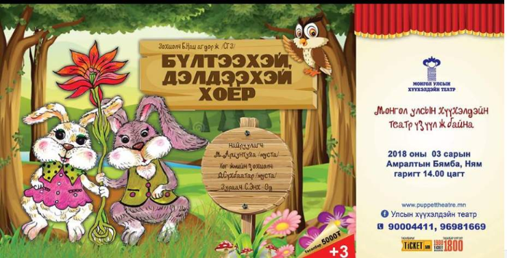 Б.Нацагдоржийн зохиол “Бүлтээхэй, Дэлдээхэй хоёр” хүүхэлдэйн жүжгийг хоёр удаа буюу өнөөдөр, маргааш 14:00 цагаас тоглоно. Тасалбарын үнэ 5000 төгрөг аж.