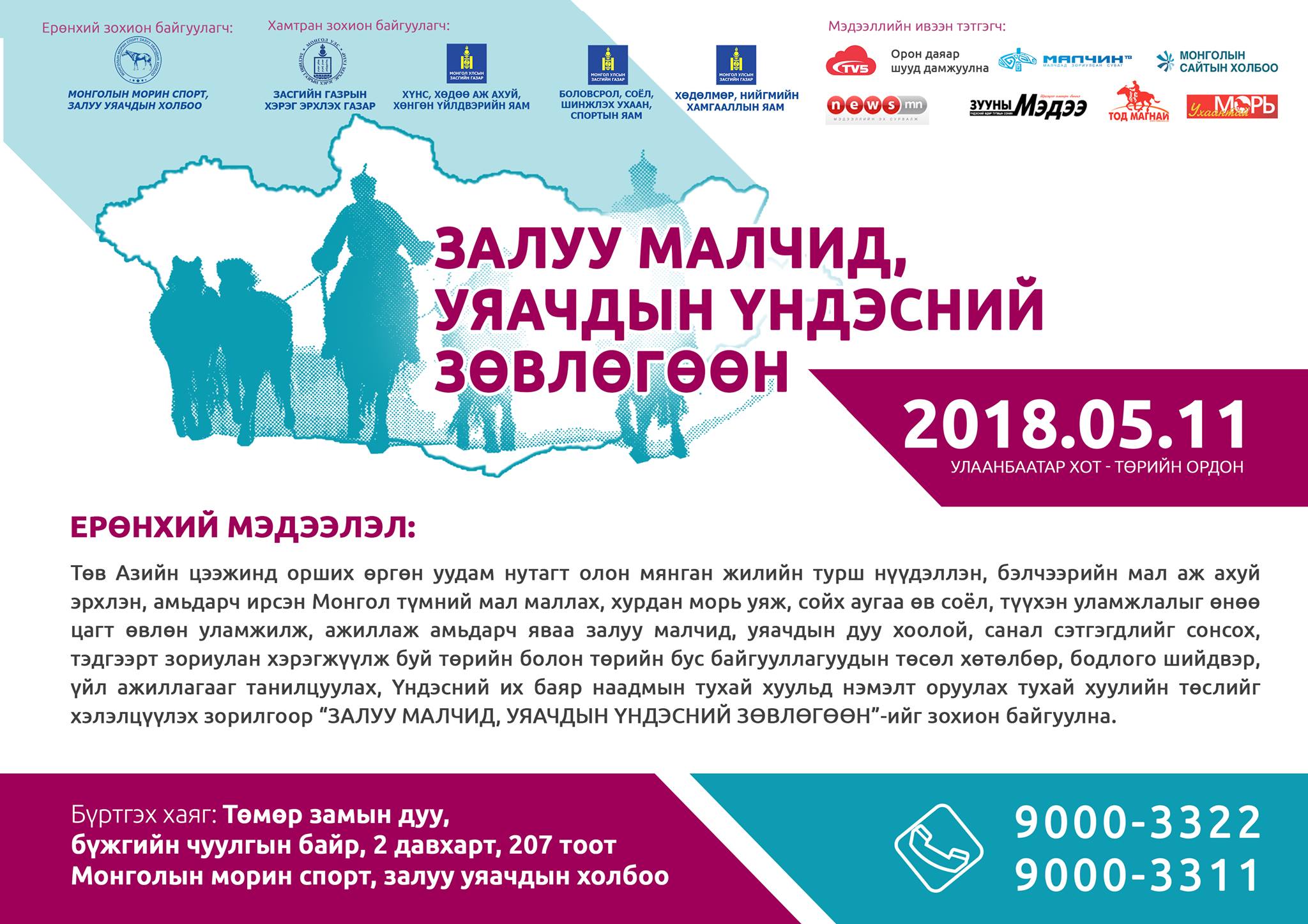 Монгол түмний мал маллах, хурдан морь уяж, сойх аугаа өв соёл, түүхэн уламжлалыг өнөө цагт өвлөн уламжилж, ажиллаж амьдарч яваа “Залуу малчид, уяачдын үндэсний зөвлөгөөн” 2018 оны 5 дугаар сарын 11-нд Монгол Улсын нийслэл Улаанбаатар хотноо, Төрийн ордоны их танхимд зохион байгуулагдах гэж байгааг өмнө нь мэдээлсэн билээ.