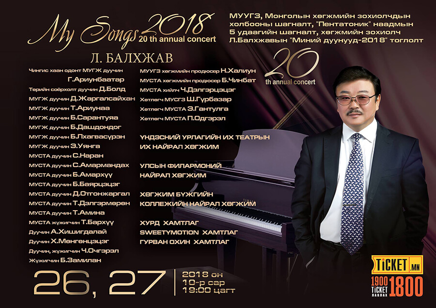 Монгол Улсын Урлагийн Гавьяат зүтгэлтэн хөгжмийн зохиолч Л.Балхжав үзэгч түмэндээ зориулан шилдэг, шинэ уран бүтээлийн дээж "Миний дуунууд" тоглолтоо 20 жилийн турш тасралтгүй сонсогч түмэндээ толилуулаад байгаа билээ. Тэгвэл энэ жил "Миний дуунууд" тоглолтын 20 дахь жилийн ойн баяр "Миний дуунууд – 2018" концерт 2018 оны аравдугаар сарын 26,27 ны өдрүүдэд UB Palace төвийн Концертын их танхимд зохион байгуулагдах гэж байна.