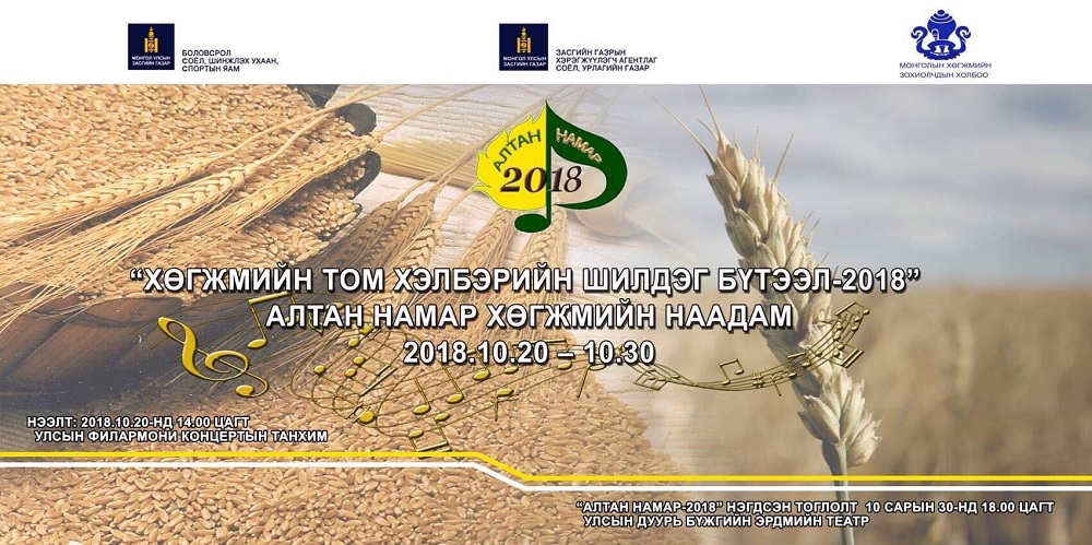 “Алтан намар-2018” наадмын шилдгийн шилдэг бүтээлүүдийн “Нэгдсэн концерт”, Улсын санд худалдан авсан бүтээлийн хөгжмийн зохиолчдод шагнал гардуулах ёслолын ажиллагаа 10 дугаар сарын 30-ны 18.00 цагт Улсын дуурь бүжгийн эрдмийн театрт болно. Хөгжмийн урлагийг дээдлэгч эрхэм та бүхнийг хүрэлцэн ирэхийг урьж байна.