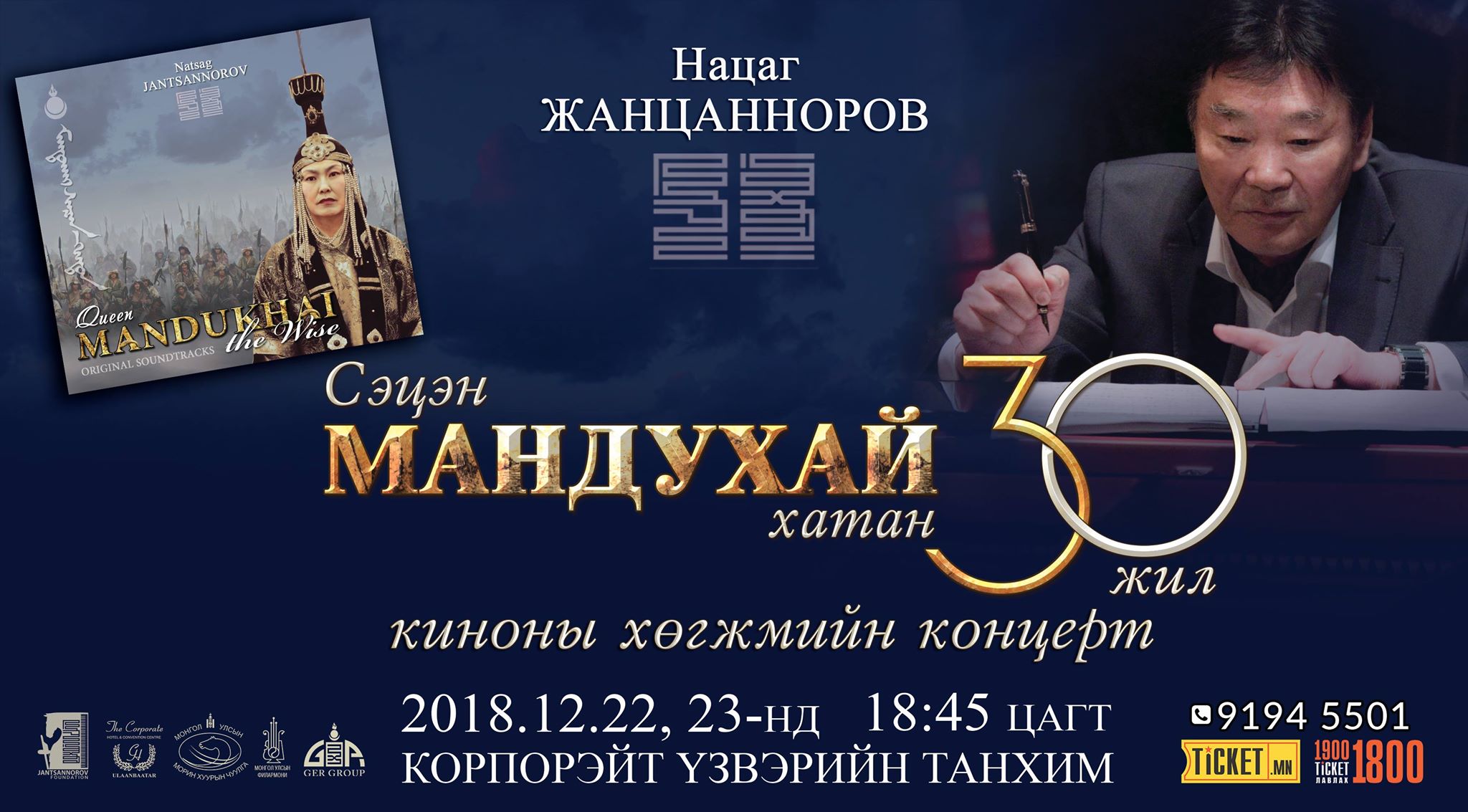 “Мандухай сэцэн хатан” кино нь бүхэлдээ уран сайхны тэргүүн бүтээлийн болсноор өнөө цагийн монголчуудын соёлын дархлааны нэг болж, төр засгаас өндрөөр үнэлэгдэн уран бүтээлчид нь төрийн дээд шагналууд авсныг та бүхэн бэлхнээ мэдэх билээ. Тус киноны 30 жилийн ойд зориулан хөгжмийг бүрэн эхээр нь 2018.12.22,23-нд Corporate Convention Centre-ийн Концертын танхимд 18:45 цагаас тоглоно. Ийнхүү хөгжмийн урлагийг дээдлэгч та бүхэн тус тоглолтын тасалбарыг TICKET.mn сайтаар ЭНД ДАРЖ шууд захиалах боломжтой бөгөөд 1900-1800 дугаараар захиалан үнэгүй хүргүүлээрэй. Мөн дэлгэрэнгүй мэдээллийг 91945501 дугаараас лавлаарай.