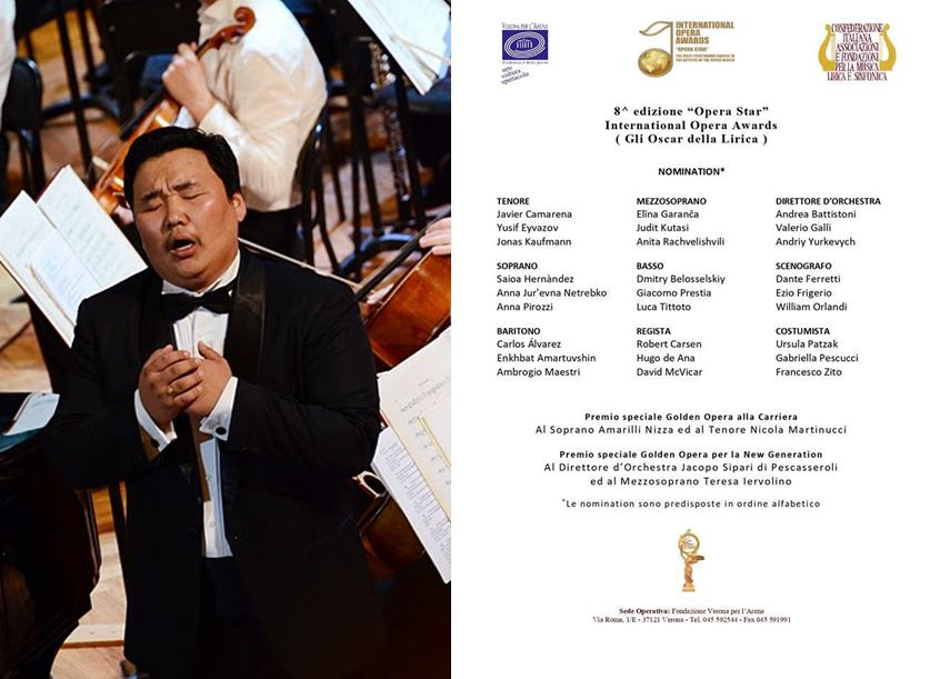 Италийн засгийн газар болон ерөнхийлөгчийн ивээл дор, тус улсын Соёлын өв бүтээл, аялал жуулчлалын яам, Залуучуудын холбоод, Олон улсын дуурийн театруудын хамтарсан холбоод, Симфони найрал хөгжмийн холбоод болон ВЕРОНА сан зэрэг мэргэжлийн өндөр статустай, олон улсын сонгодог урлагийн сангууд хамтран зохион байгуулдаг, олон улсын дуурийн найм дахь удаагийн нэрэмжит шагнал болох дуурийн "Оскар”-т Монгол Улсын дуурийн гавъяат жүжигчин Э.Амартүвшин нэр дэвшчээ. Энэхүү хүндтэй шагналд шилдэг симфони хөгжмийн удирдаач гурав, дуурийн найруулагчид гурав, театрын төрөлд гурав, урлагийн хувцасны дизайнерууд зэрэг 27 шилдэг урлагийн зүтгэлтнүүд багтсан байна.