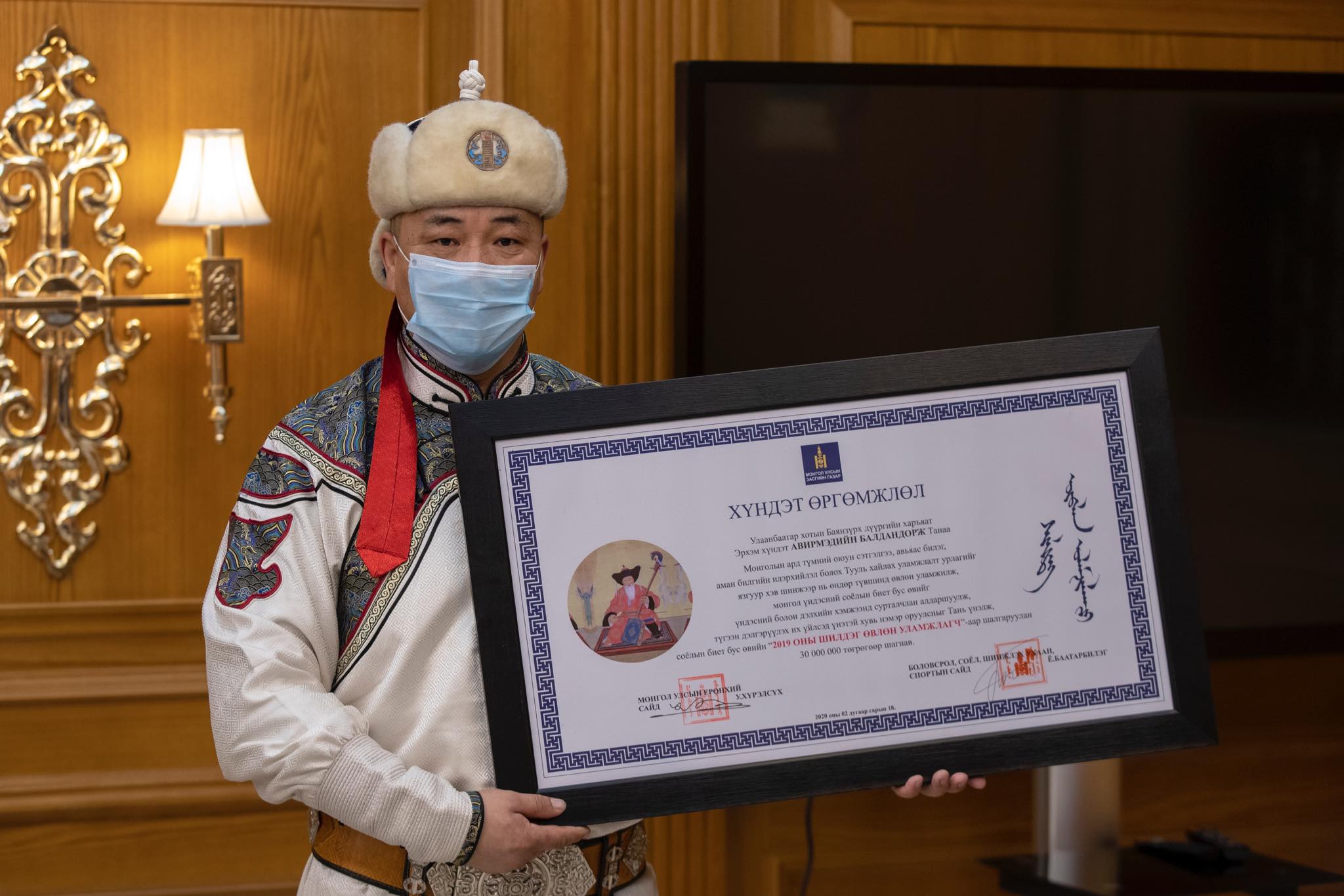 Монгол Улсын Засгийн газраас “Соёлын биет бус өвийг үндэсний болон дэлхийн хэмжээнд сурталчлан алдаршуулах, түгээн дэлгэрүүлэхэд онцгой хувь нэмэр оруулсан өвлөн уламжлагчид мөнгөн шагнал олгох журам”-ыг баталж, хоёр дахь жилдээ шилдэг өвлөн уламжлагчийг шалгаруулан урамшууллаа. Энэ жил 21 аймаг, нийслэлээс нийт 21 өвлөн уламжлагч нэр дэвшсэнээс туульч А.Балдандорж шалгарч, өвлийн адаг сарын шинийн 25-ны билигт сайн өдөр Монгол Улсын Ерөнхий сайд У.Хүрэлсүхээс хүндэт өргөмжлөл, 30,0 сая төгрөгийн шагналыг гардлаа.