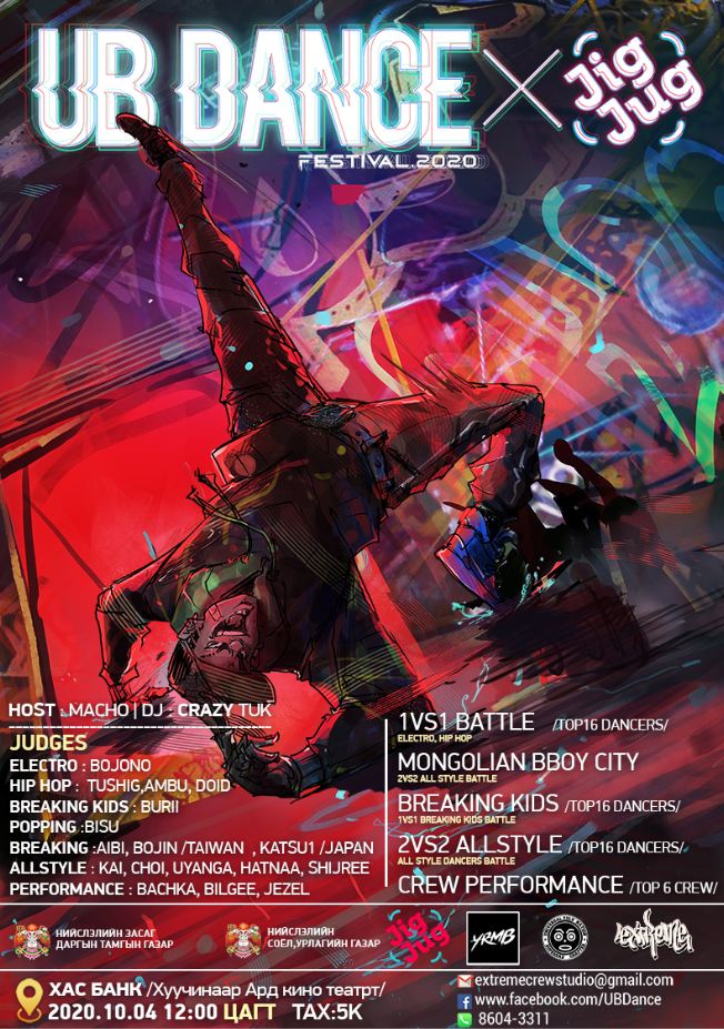 Экстримкрейв студээс санаачлан НЗДТГ, НСУГ-тай хамтран “UB Dance festival 2020” орчин үеийн бүжгийн олон улсын онлайн наадмыг 2020 оны 09 дүгээр сарын 12-ноос 10 дугаар сарын 04-ны хооронд Улаанбаатар хотноо зохион байгуулж байна.