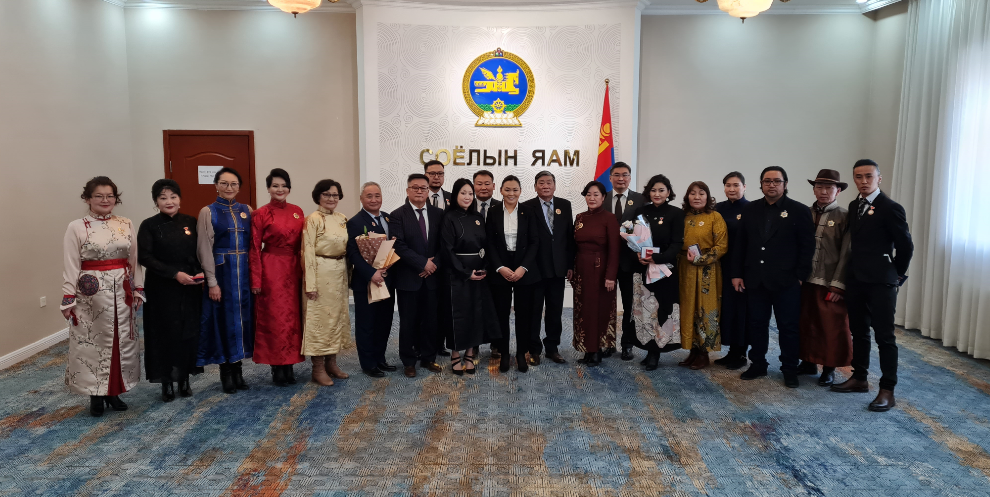 Монгол Улсын Ерөнхийлөгчийн зарлигаар Соёл, урлагийн салбарт олон жил үр бүтээлтэй ажилласан хувь нэмрийг нь үнэлж, ажил хөдөлмөрөөрөө тэргүүлсэн хүмүүст төрийн дээд шагнал гардуулах ёслол өнөөдөр боллоо. Шагналыг Соёлын сайд Ч.Номин, Төрийн нарийн бичгийн дарга Г.Эрдэнэбат нар гардуулжээ.
