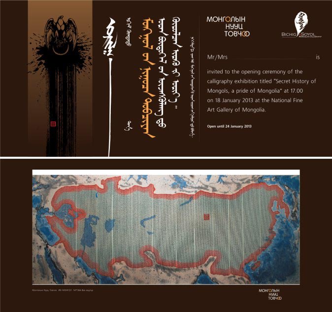 Монголын нууц товчоо бол Монголын их хаадын угсаа гарвал, монголчуудын ахуй амьдрал, үндэсний түүх, хэл бичиг, ардын аман зохиол, бөө мөргөл, зан заншлын их нэвтэрхий толь, монгол хэлний үгийн урлагийн сонгодог бүтээл, эрин зууныг эзэлсэн их туульс,  түүх, он цагийн дарааллын бичиг билээ.Бичиг соёлын түүхэн дурсгал болох Монголын нууц товчоогоор “Бичиг соёл” төвийн уран бүтээлчид сүүлийн хоёр жилийн хугацаанд Тамгат, Их Монгол, Түүхэн цаг, Хүлэг баатрууд, Шүтээн, Тэнгэрийн Хас нэрт Монголын нууц товчоог бүхэлд нь багтаасан зургаан бүтээл туурвижээ.Эдгээр бүтээлийг дэлгэсэн “Монголын нууц товчоо Монгол бахархал” үзэсгэлэн энэ сарын 25-ныг хүртэл Уран зургийн галерейд үргэлжилнэ.Мөн бэхэн зураг, каллиграфын бүтээлүүдийг эндээс сонирхож болох бөгөөд түүх соёл, монгол бичгээрээ бахархаж, сурч мэдэх хүсэл тэмүүлэлд таныг хөтлөх бүтээлүүдтэй танилцахыг хүсвэл энэ сарын 25-наас өмнө амжиж Уран зургийн галерейг зориорой.