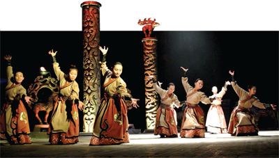 Хөгжимд эх газрын догшин салхи жигд хэмээр хүүгэж шуугина. Салхинд уруудсан адуун сүргийн үүрсэх дуу,чонын улиан, туурайн чимээ тачигнана. Агтчин, адуучин эрсийн хайя хүйе гэх яаруу сандруу дуу сонсогдоно. Умрын салхи Дорно Өрнийг даран салхилах нь энэ аж. Хөгжим солигдож шинэ үзүүлбэр эхлэхэд тайзны голд эрэгтэй эмэгтэй бүжигчид нэг үе үелзэн бөөгнөрч, нэг үе үелзэн задгайрч, үе үе эрчлэн хуйларч бадамлан асах мэт хөдөлгөөн зонхилох нь Хүннү Гүрэн Төрт улсын мандал бадрал, гал голомтын мөнхийн бэлгэдлийг илэрхийлэх мэт. “Галт тэнгэр” хэмээх зан үйлийн гайхамшигт бүжгийг тус чуулгын бүжиг дэглээч А.Даваахүү дэглэж хөгжмийг хөгжмийн зохиолч Д.Ариунболд бичжээ.
